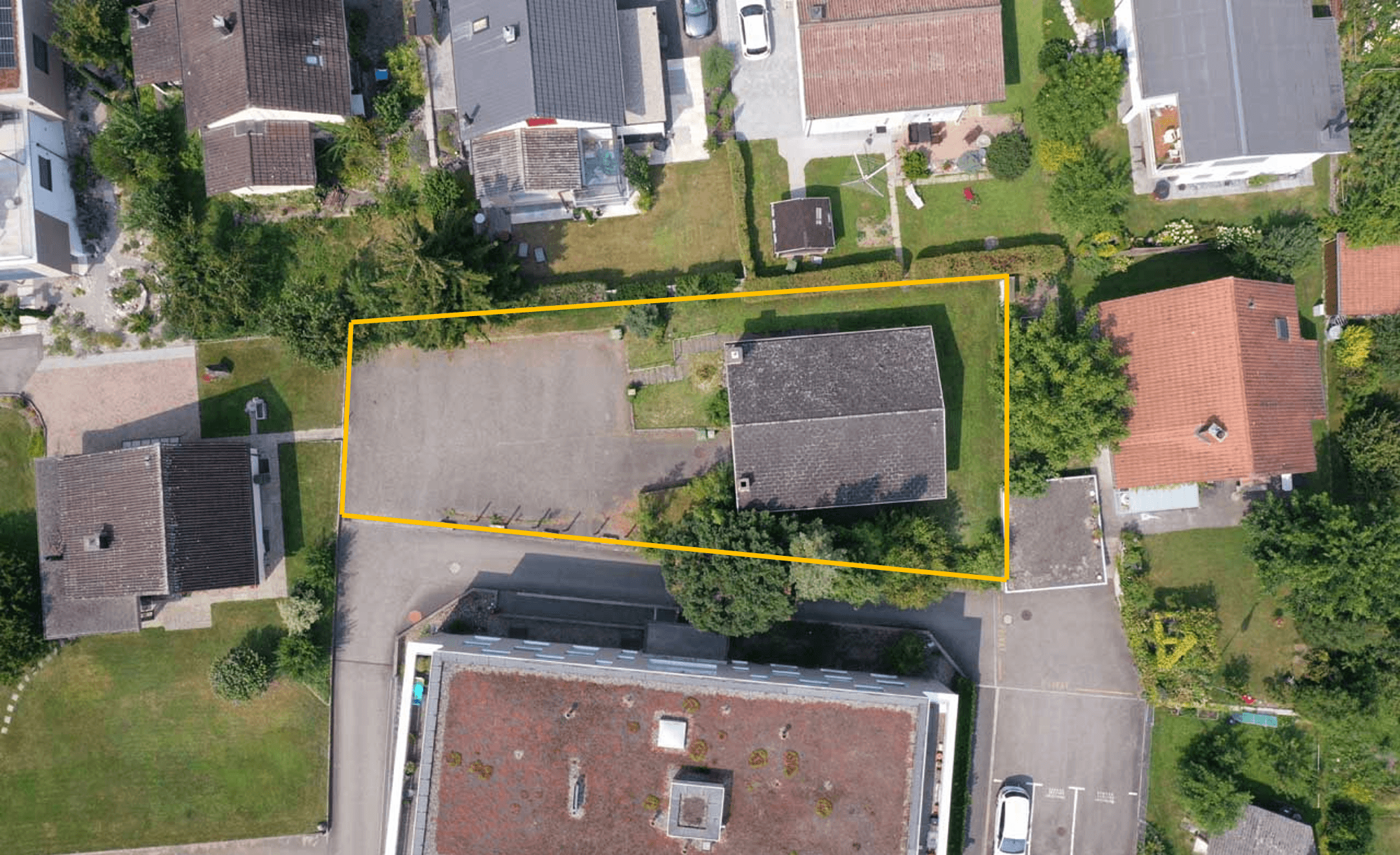 Aktuell erstreckt sich ein riesiger Abstell- / Wendeplatz auf dem Grundstück. Bei einem Neubauprojekt bietet sich ein vielfältiger Spielraum für die Garten- und Terrassengestaltung an.